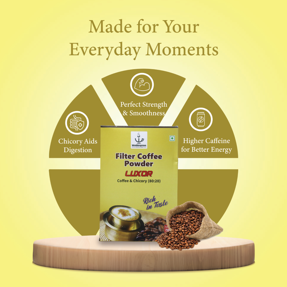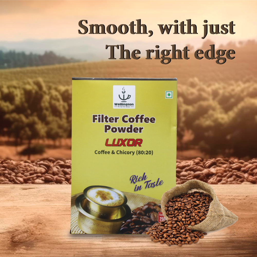 Elevate your coffee ritual with Wellington Filter Coffee Powder Luxor. This blend of 80% high-quality coffee and 20% chicory is carefully crafted for a deep, full-bodied flavour that brings café-style filter coffee to your home. Rich in aroma and taste, it brews a perfect cup to jump-start your day or keep you going through late hours. Whether served black or with milk, it delivers consistent strength, smoothness, and satisfaction.